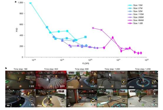 在连贯性测试中,团队使用了FVD指标来衡量生成游戏画面与真实游戏画面之间的相似度。结果显示,随着模型规模的增大和计算资源的增加,FVD指标显著降低,表明生成的游戏画面与真实画面之间的差异越来越小。